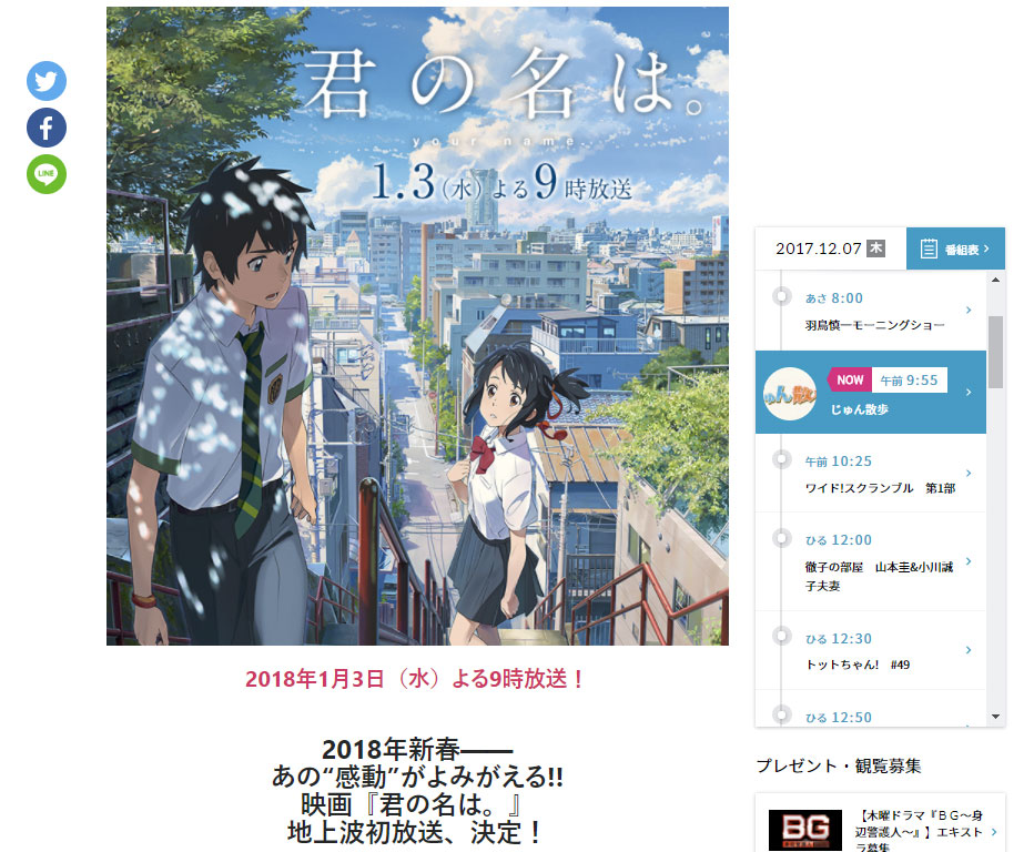 「君の名は。」地上波初放送決まりましたね!