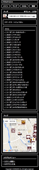 冒険者たち(お誕生日の勇者+仲間たち7名の合計8名)が使うステータスやマップ情報を確認する為のツールをHTMLで製作しました。このツール(ID:test01/PW:0000でログイン可)のアピールポイントは以下です。
