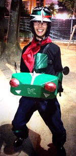 友人のお誕生日サプライズで「お誕生日会の待ち合わせ場所に行ったら、事件に巻き込まれてなんだかんだしてる間に仮面ライダーに変身することになっちゃって、気付いたら怪人を倒して悪の秘密結社の野望を打ち砕いたと思ったところでようやくお誕生日会。」という企画。シナリオから衣装から何もかも手作りです。後半出てくるベルト操作マニュアルが一応サーバーの自動返信メールを使った仕組みになっていたりします。